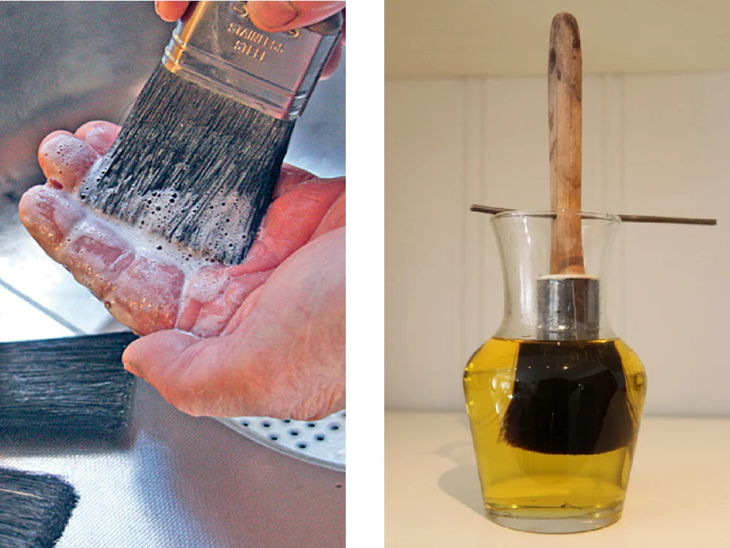 During the work, you can hang brushes with the bristles in Purified Raw Linseed Oil, so they do not solidify and harden. It is then sufficient to wipe the oil from brushes in a cloth before continuing again with the paint. When you have finished painting and the brushes are to be washed, clean them with Linseed Soap.