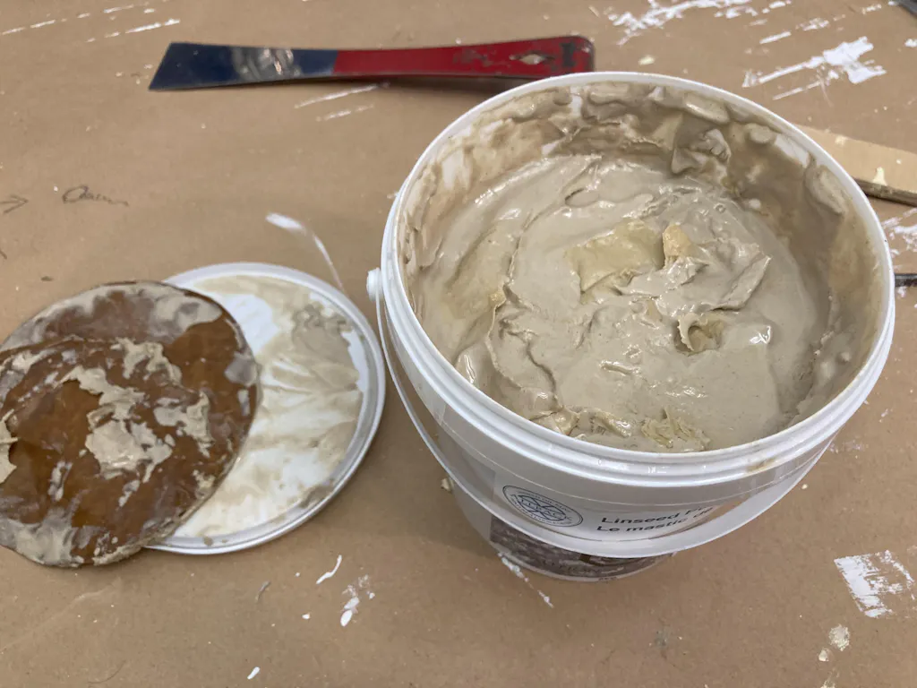 Remove the entire contents from the container and knead well before using. If the putty is too soft, allow to cool, or set on an absorbent surface to soak off some oil, or sparingly add some Allbäck Chalk Powder. If the putty is too firm, warm it up or add some Allbäck Purified Raw Linseed Oil.